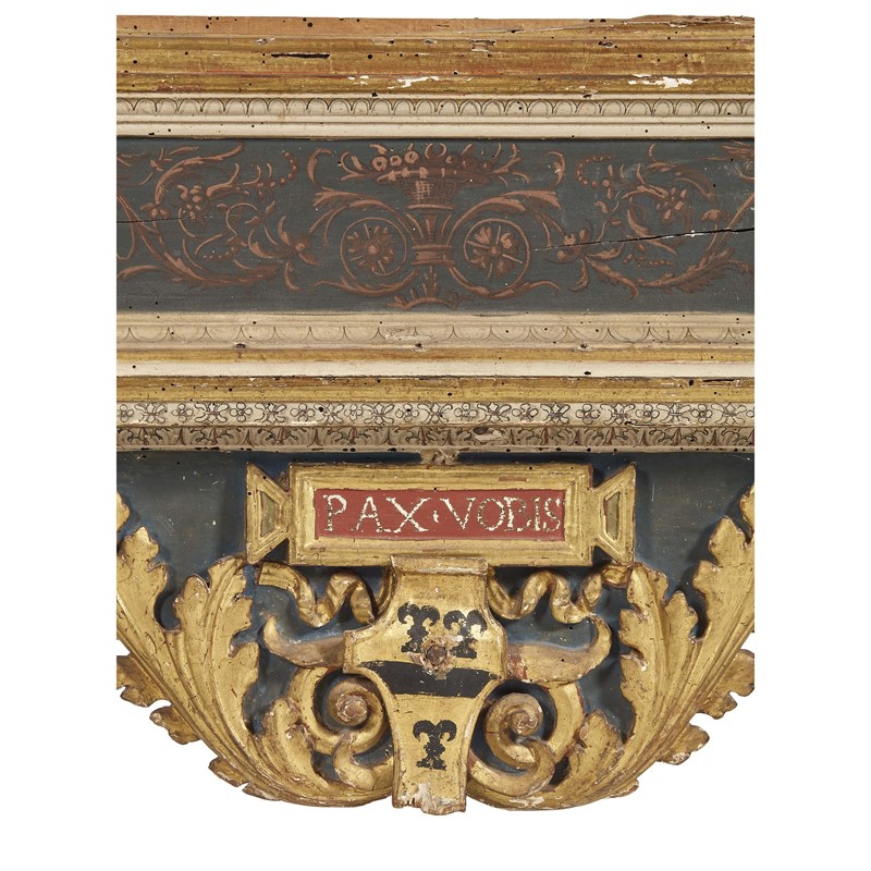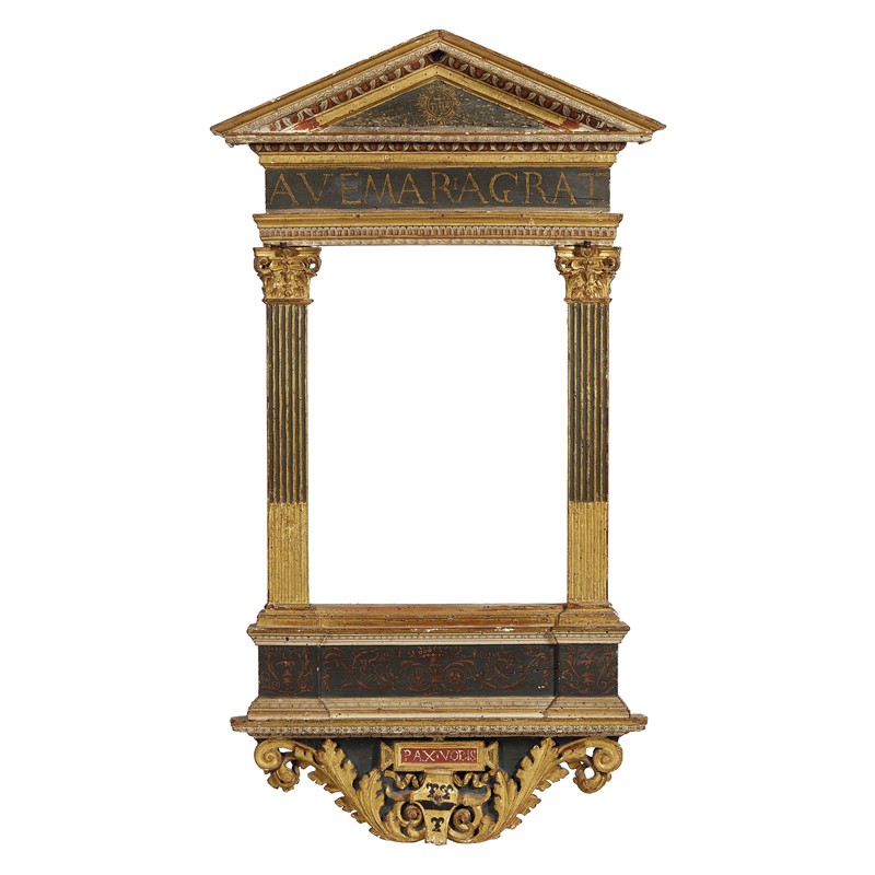 in legno dipinto e dorato, di forma architettonica con grande timpano aggettante dipinto con monogramma bernardiniano in oro su fondo blu, sovrastante grande fascia dipinta a fondo blu iscritta AVE MARIA GRAT, sostenuta da coppia di colonne scanalate dipinte d’oro e di blu con capitello corinzio, poggianti su fascia decorata a rabeschi e cornucopie su grande mensola riccamente intagliata a girali e volute dorate centrata dallo stemma della famiglia senese Rocchi (d'oro, alla fascia di nero, accompagnata da tre rocchi di scacchiere dello stesso, 2.1) sormontato a sua volta da cartella recante scritta PAX.VOBIS; ingombro cm 139x75,5, luce cm 60,5x43,5