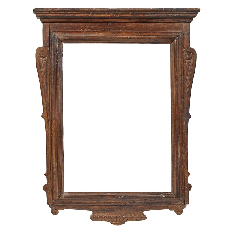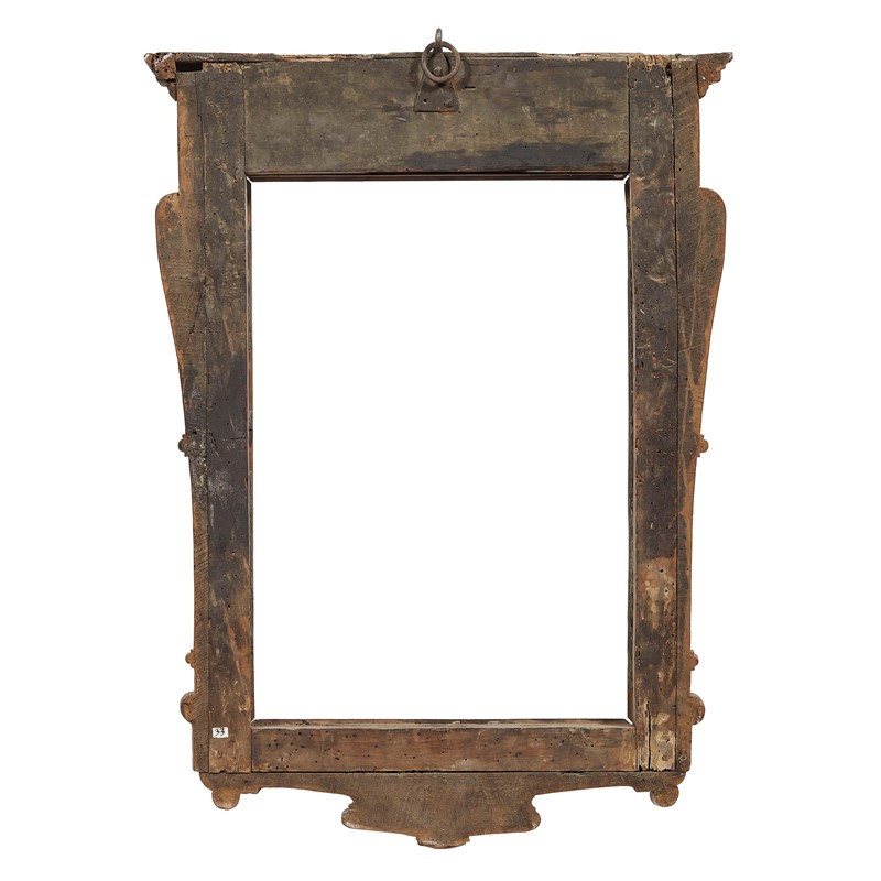 in noce intagliato, battuta che risale con un susseguirsi di sottili gole lisce e rovesce e riscende in fascia liscia; di forma architettonica, ai lati due elementi a motivo di esile. La cornice è sormontata da un frontone aggettante e digradante in più ordini di modanature in fascia liscia mentre sul basso si porta a muro mediante profilo sagomato e intagliato a baccellature; ingombro cm 79x59,5, luce 53,8x39