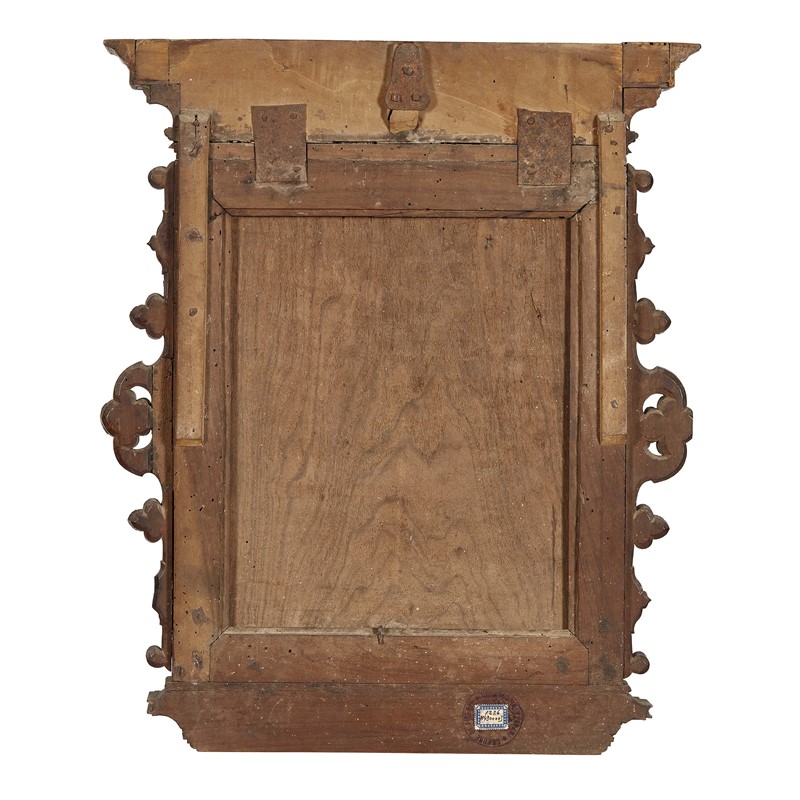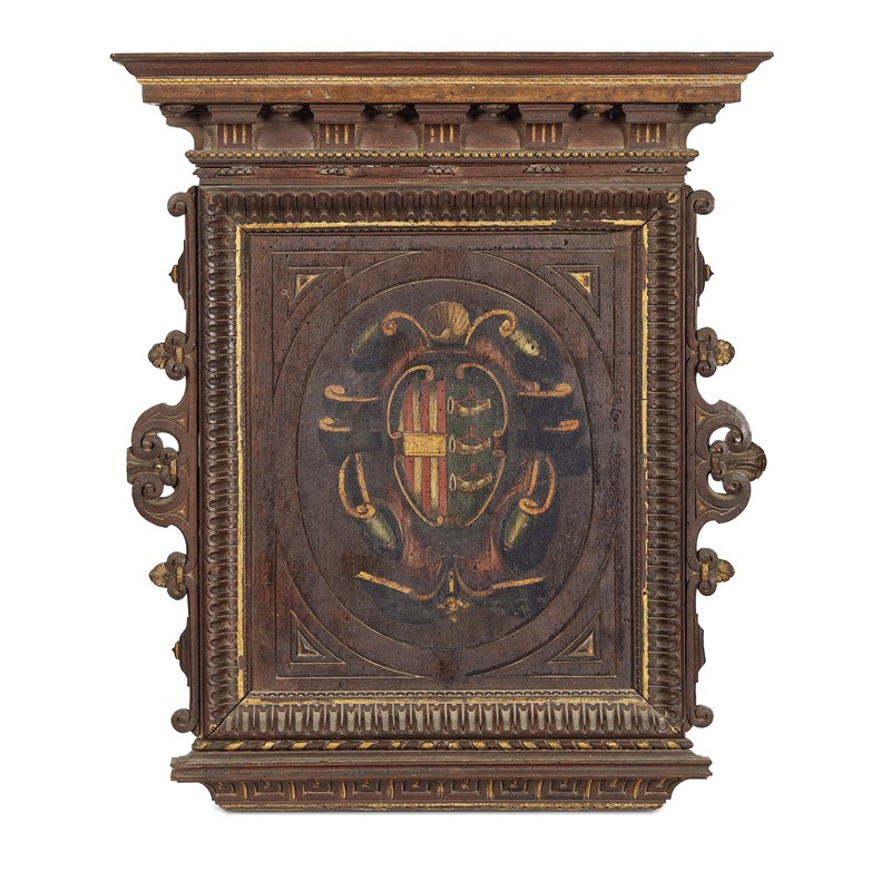 in noce intagliato con lumeggiature in oro, sottile fascia a unghiature si porta su profilatura dorata che sale a sua volta in gola morbida intagliata anch’essa a unghiature; di forma architettonica, presenta grande frontone aggettante decorato con rosette e mensole con gole scanalate, i lati impreziositi da volute traforate mentre la mensola inferiore è intagliata a greca con lumeggiature dorate. Al centro, su tavola estraibile con scorrimento a destra rivelante vano a giorno, reca lo stemma partito delle famiglie fiorentine Nerli e Guicciardini, dipinto in policromia entro cartouches sormontata da conchiglia; ingombro cm 59x50, luce 35,2x29,8