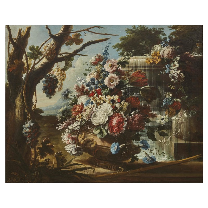 Gaspare Lopez detto Gasparo dei Fiori (Napoli - Firenze 1740) NATURA MORTA CON VASO DI FIORI, FICHI E MELOGRANO NATURA MORTA CON VASO DI FIORI E UVA coppia di dipinti, olio su tela, cm 80x98,5