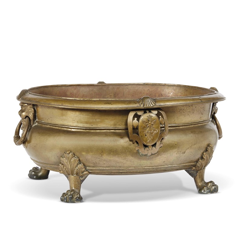 in ottone sbalzato, fuso e cesellato di forma ovale, il bordo estroflesso decorato da quattro conchiglie nei punti cardinali, sotteso da fascia liscia ai cui lati protomi leonine stringono tra le fauci maniglie circolari. Al centro della fascia campeggia lo stemma della famiglia Orsetti di Lucca (troncato: nel primo d’azzurro, all’aquila dal volo spiegato di nero, coronata d’oro; nel secondo di rosso, a tre steli di frumento d’oro appuntati in ventaglio, e sormontati da due stelle a otto punte dello stesso) entro cartiglio traforato, corpo dalla linea leggermente rigonfia sorretto da quattro zampe ferine impreziosite all’attacco da foglia aperta, cm 32,5x73,5x55