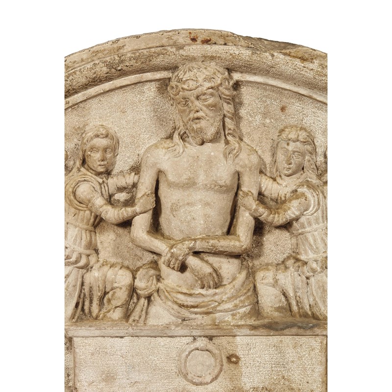 Le fattezze crude e accigliate dei volti, l’articolazione statica degli angeli, essenziale ma animata nelle ricadute delle vesti da un reticolo di pieghe più complesse e tormentate di matrice lombardesca, insieme all’uso di una pietra calcarea di colore giallo dorato identificabile come ‘pietra di Nanto’, suggeriscono di ricondurre l’opera in esame al territorio vicentino, dove questo schema iconografico fu ampiamente utilizzato per le cimase delle pale d’altare e il coronamento dei tabernacoli eucaristici - si veda, ad esempio, la Madonna e santi in Santa Maria Annunziata a Nanto, o i tabernacoli nella parrocchiale di Molina di Malo e di Torri di Quartesolo (1488) -, ravvisando esiti stilistici prossimi ai modi di Tommaso da Lugano e Bernardino da Como, autori del trittico nell’oratorio della chiesa di San Vitale a Montecchio Maggiore e responsabili di una prolifica bottega attiva a Vicenza tra il 1475 e il 1510 circa (F. Barbieri, Scultori a Vicenza. 1580-1520, Vicenza 1984, pp. 44-52).