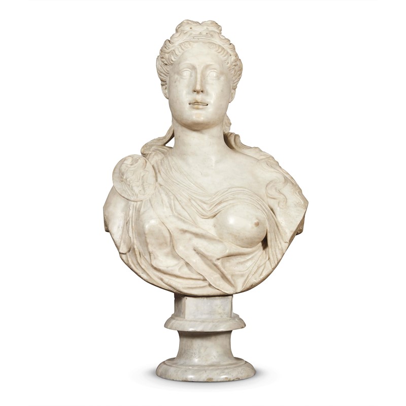 Questo seducente busto femminile, caratterizzato da tratti di sofisticata, algida eleganza enfatizzati da un’elaborata acconciatura e da una tunica ‘all’antica’ (chitone) serrata sulla spalla da una grande fibula sottilmente scolpita come un cammeo, che ne lascia scoperto un seno messo in risalto dall’andamento del velo adagiato sulla coppa, vanta attribuzioni prestigiose argomentate da autorevoli specialisti della scultura del Cinquecento, ed è già stata plausibilmente identificato come una raffigurazione della Musa Clio, la prima delle nove Muse figlie di Zeus e di Mnemosine ispiratrice della poesia epica e della storia, tradizionalmente rappresentata in atto di scrivere come appunto l’immagine che risalta sul vistoso fermaglio della veste.