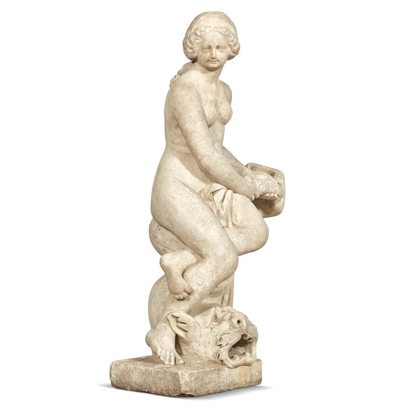 La figura femminile sedente, con una sontuosa acconciatura e intenta a tenere per la coda un essere pisciforme, forse un delfino, deve interpretarsi come una Venere. Pur presentando la superficie parzialmente consunta, a causa di una probabile, lunga esposizione all'esterno, la statua si rivela integra. Deve inoltre immaginarsi esposta in una fontana, probabilmente in una struttura addossata alla parete vista la lavorazione più corsiva del retro.