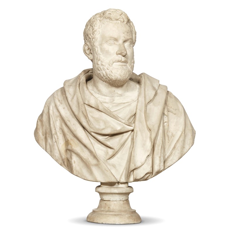 Questo busto panneggiato, avvolto in un'ampia tunica secondo il costume in uso nella Roma antica, deve ritenersi un prodotto della Firenze di fine Cinquecento, al più degli inizi del secolo successivo. Non è nota l'identità dell'effigiato, nulla nell'abbigliamento fornisce dettagli al riguardo, e non è ugualmente conosciuto il contesto di provenienza, ovvero il palazzo o il complesso funerario in cui era esposto. Al di là di una leggera consunzione superficiale e di alcune limitate fratture, l'opera si presenta in ottimo stato.