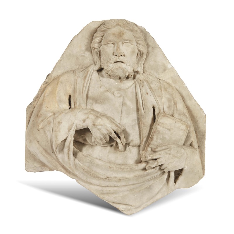 L’inedito rilievo, concepito presumibilmente come cuspide di un monumento sepolcrale o di un portale, secondo un uso ricorrente nella scultura gotica, richiama i modi di Tino di Camaino, protagonista con la sua folta, operosa bottega della scena artistica toscana e napoletana del primo Trecento (F. Baldelli, Tino di Camaino, Morbio Inferiore 2007). Lo suggeriscono il taglio assai allungato degli occhi, l’arricciarsi della barba in ordinate ciocche a lumachella, ben definite e traforate a trapano, l’inarcarsi dolente della bocca, la gestualità prensile delle mani, così come l’ampiezza del panneggio che si distende in nitide falde lunate, come nei Santi vescovi della smembrata Arca di San Bartolo in Sant’Agostino a San Gimignano, databile intorno al 1320, in prossimità delle più rilevanti commissioni fiorentine.