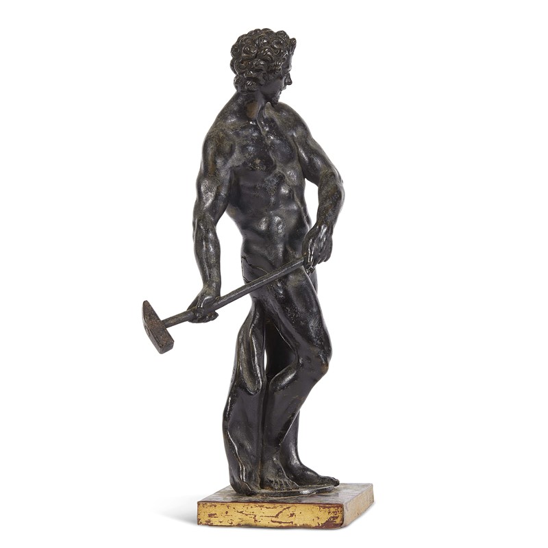 Il Dio, signore del fuoco e lavoratore dei metalli, è raffigurato in torsione mentre impugna il martello pronto a sferrare un colpo sull’incudine. La precisione nei dettagli, nella resa attenta della muscolatura, della barba e della capigliatura, così come il volto con la fronte corrugata a dare il senso dello sforzo, sono elementi caratteristici dell’eleganza dello scultore. Esemplari analoghi sono conservati nelle raccolte dei Musei Civici di Padova, al Museo Correr di Venezia e nella collezione Spitzer di Parigi.