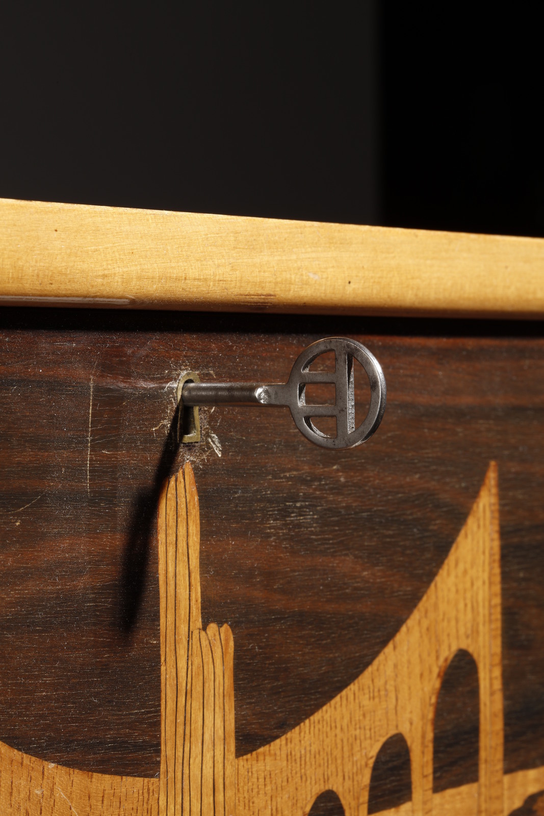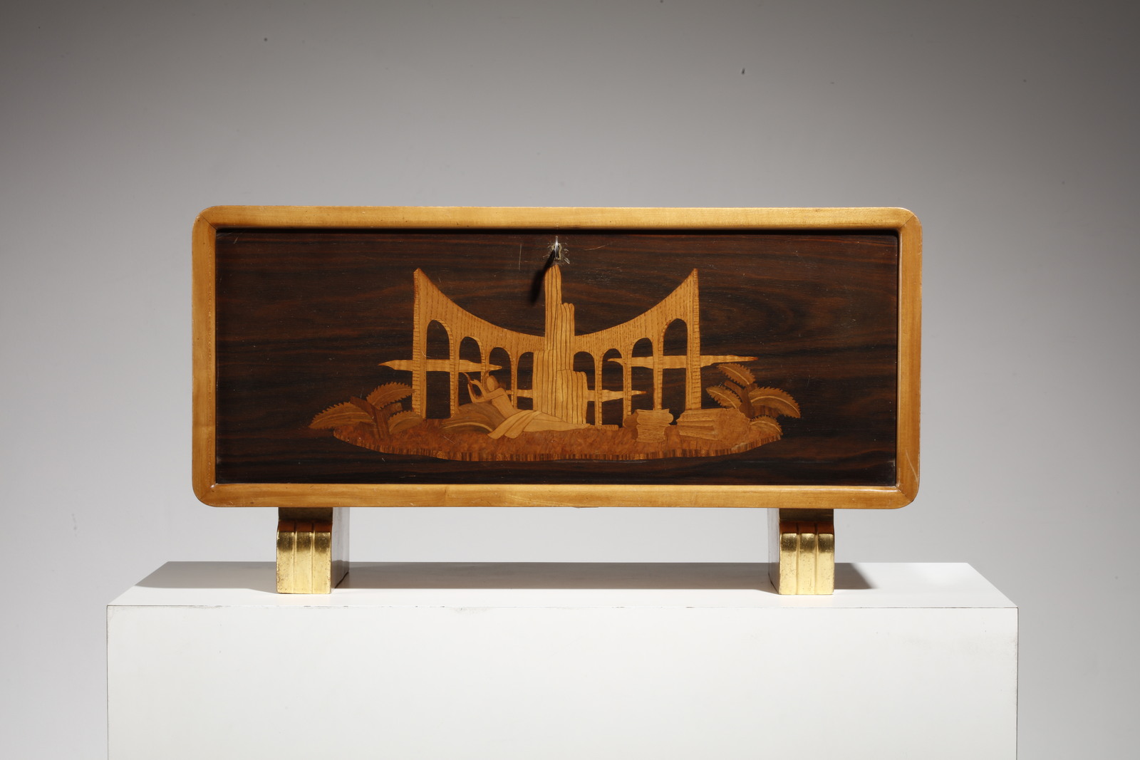 Intarsio frontale su disegno di Gio Ponti. Provenienza: Abitazione privata del pittore Renato Berti, Verona, realizzato da Luigi Scremin di Belluno. Il lotto è accompagnato dal certificato di autenticità dell'Archivio Gio Ponti, Milano.