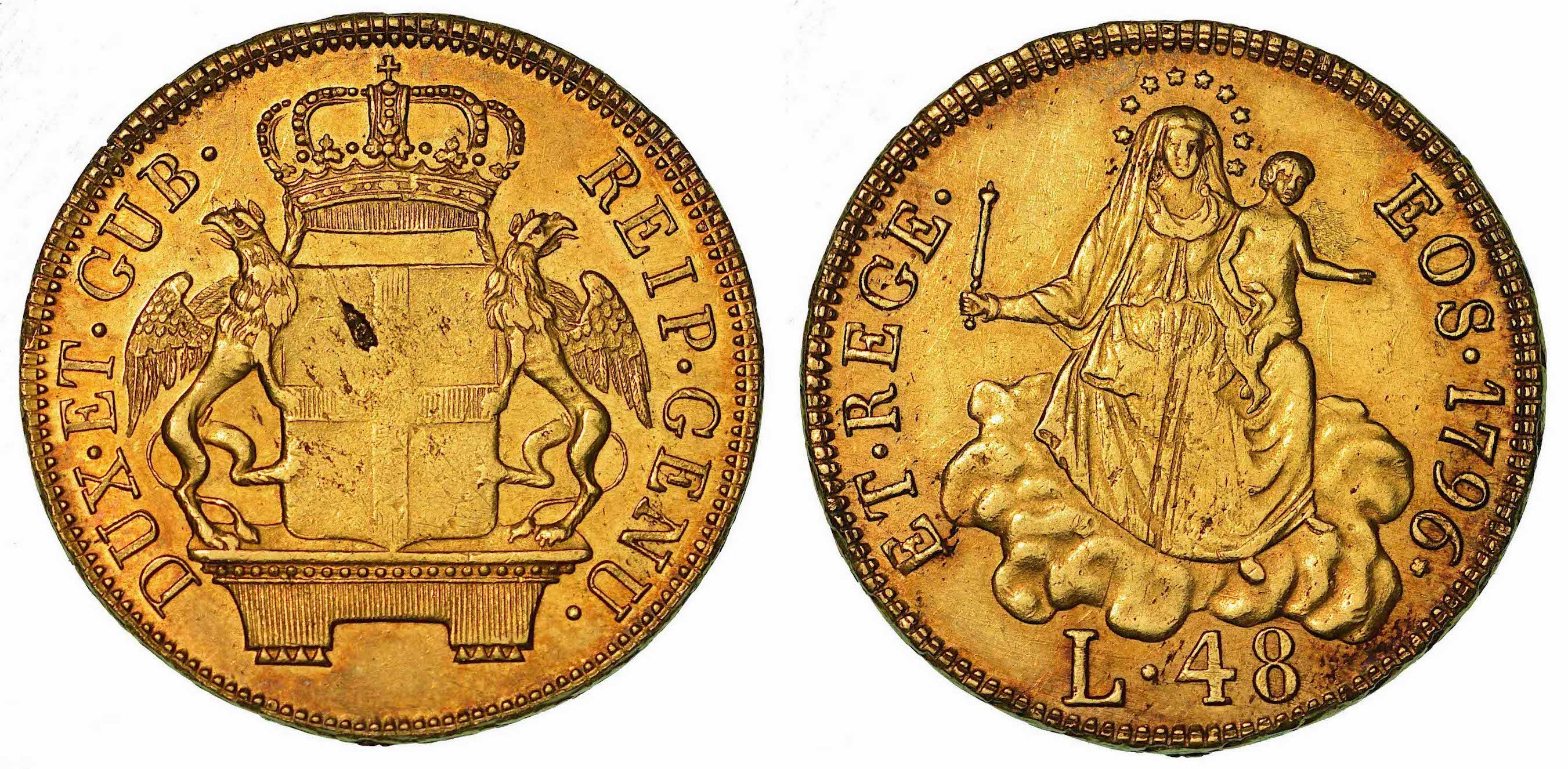 DUX • ET • GUB • REIP • GENU • Stemma coronato sorretto da due grifoni. R/ ET • REGE • EOS • 1796 (stella) La Beata Vergine con il Bambino in braccio seduta sulle nubi, tiene, nella mano d., uno scettro; sotto, L 48. Lunardi 361. MIR 277/5. Rara. g. 12,57. Diam. mm. 26,38. Oro. Lieve sfaldatura di conio al diritto. BB/SPL