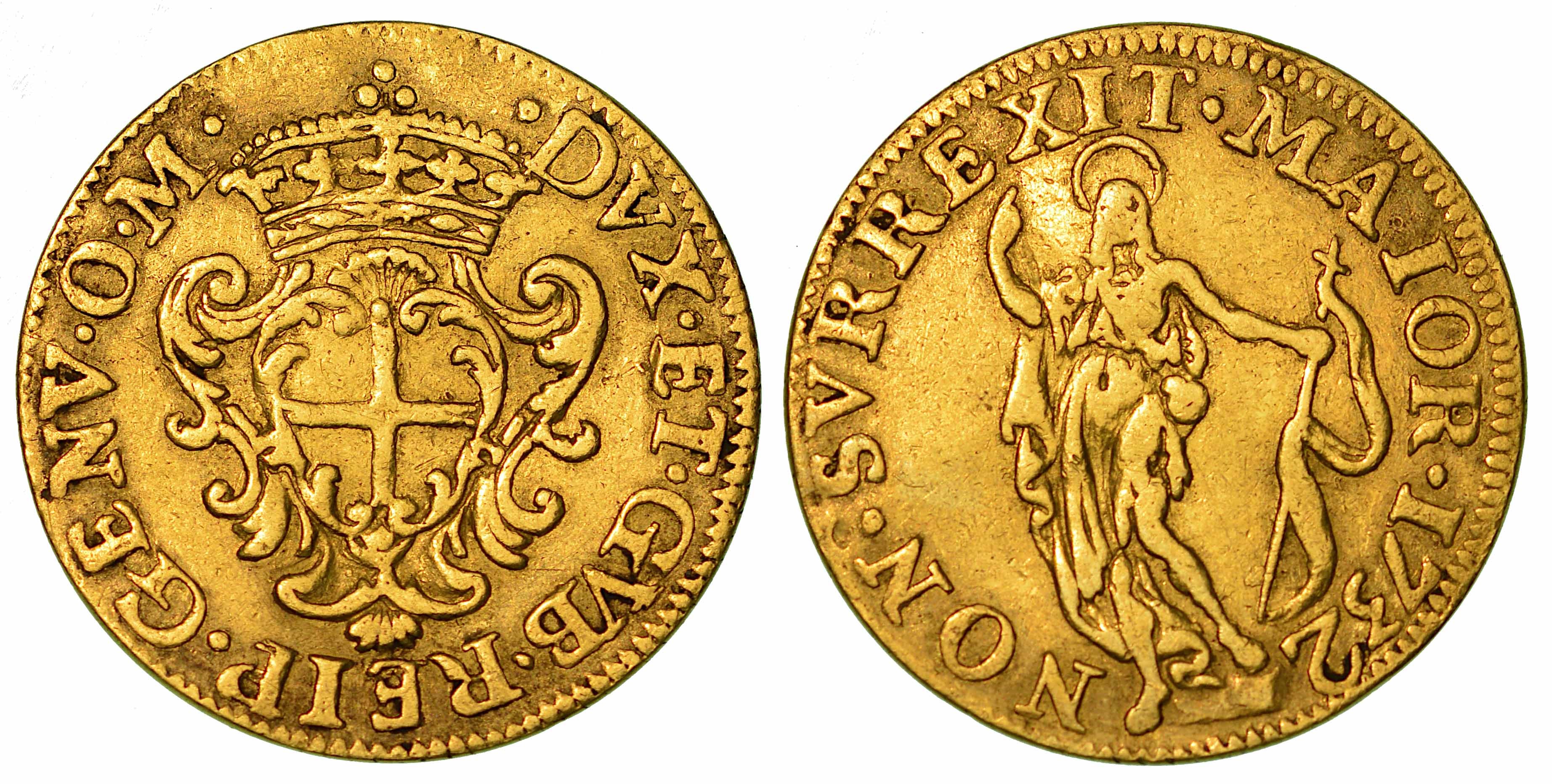 DVX • ET • GVB • REIP • GENV • O • M Stemma coronato. R/ NON • SVRREXIT • MAIOR • 1732 • S. Giovanni predicante. Lunardi 329. MIR 267/6. Raro. g. 3,32. Diam. mm. 21,46. Oro. MB/BB