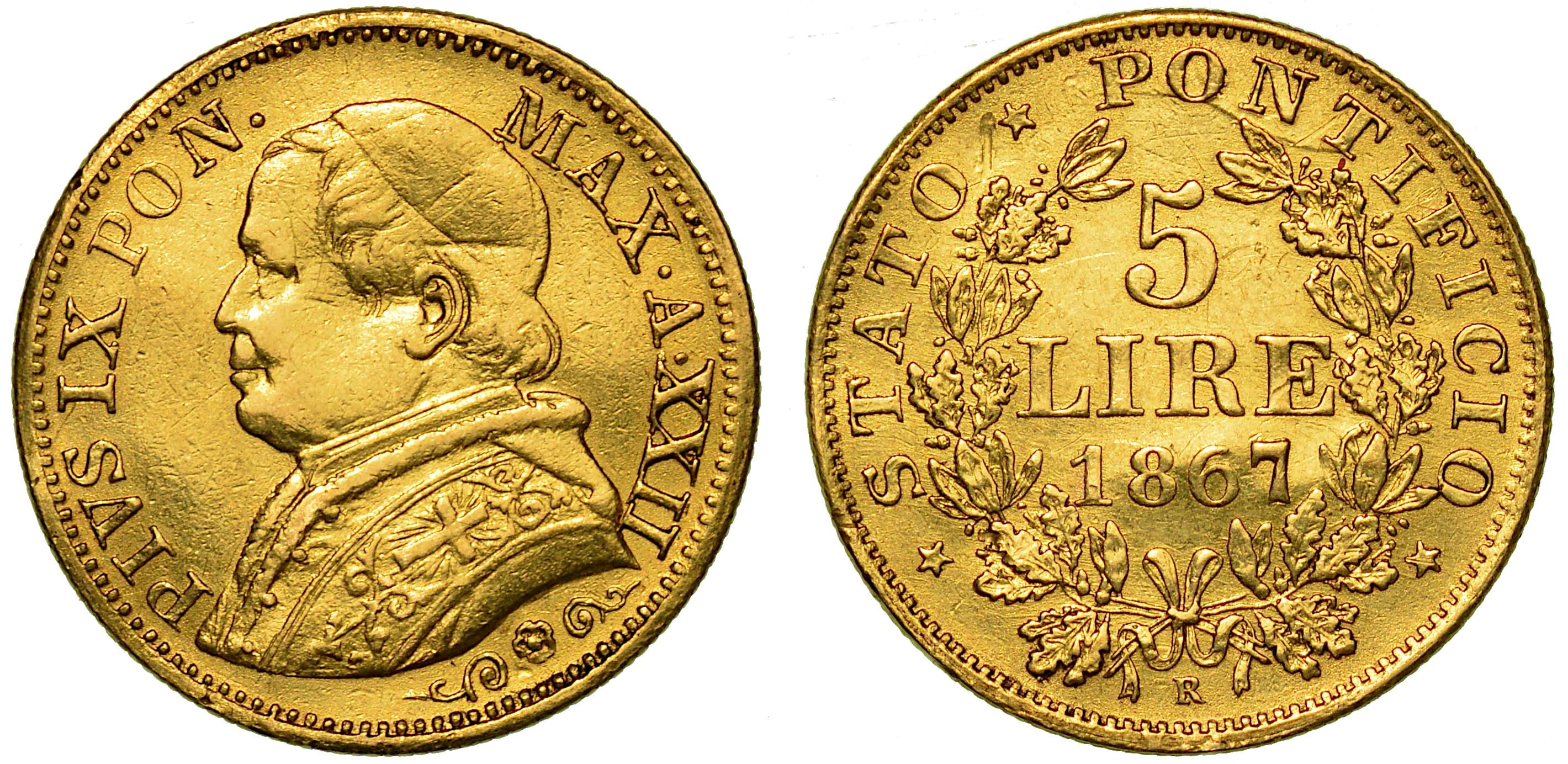 STATO PONTIFICIO. PIO IX, 1846-1878. 5 Lire 1867/A. XXII.