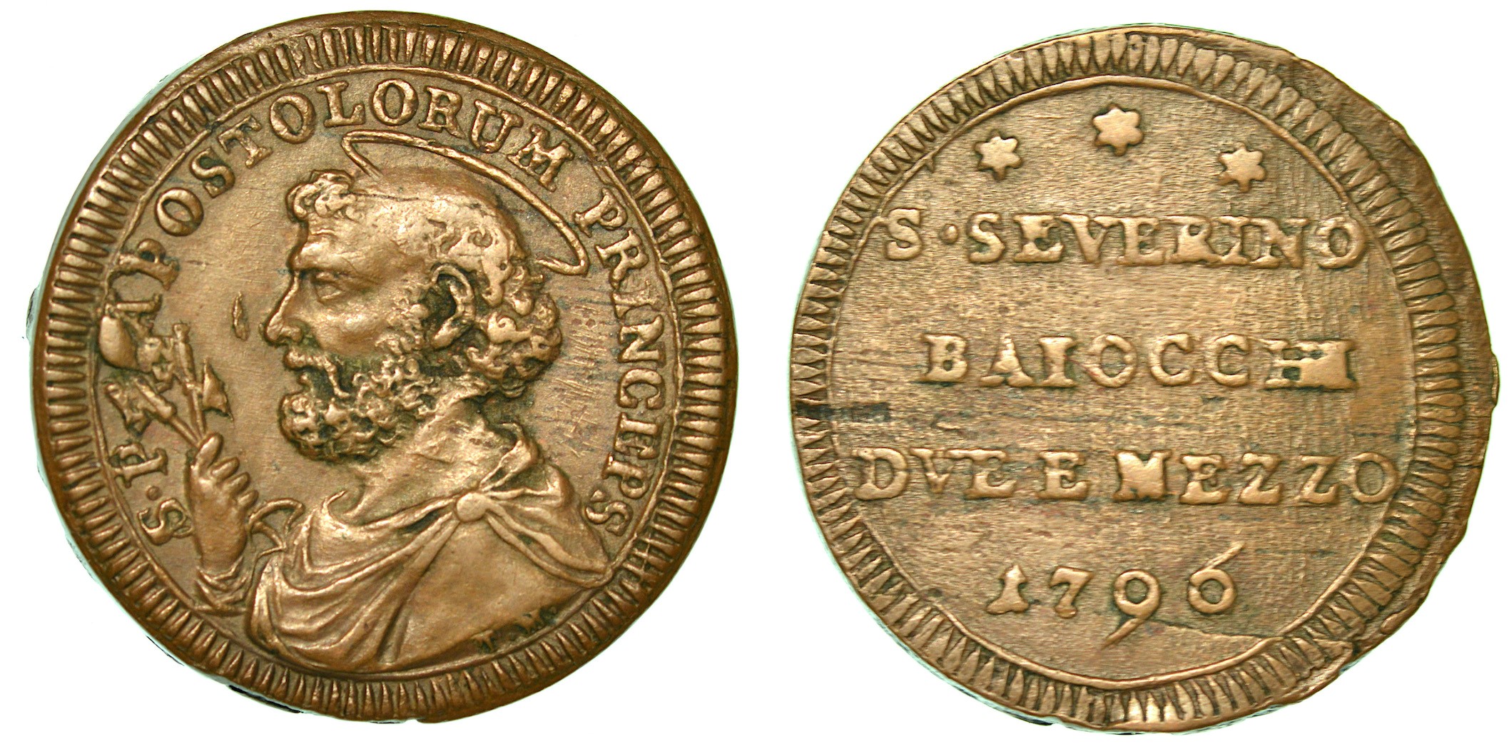 STATO PONTIFICIO. PIO VI, 1775-1799. 2 e 1/2 Baiocchi 1796. San Severino.