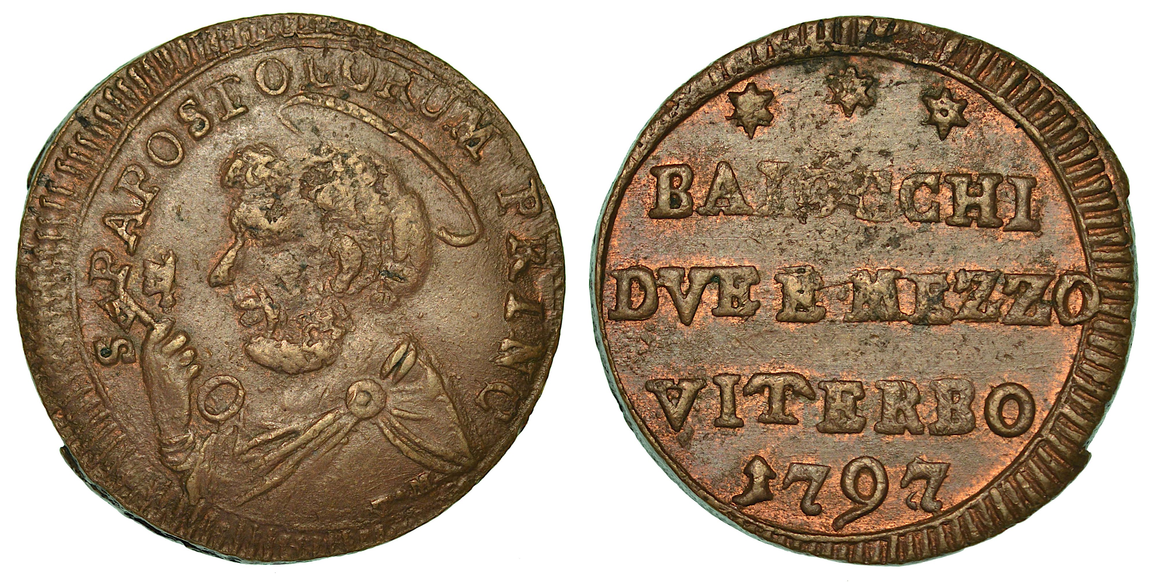 STATO PONTIFICO. PIO VI, 1775-1799. 2 e 1/2 Baiocchi 1797. Viterbo.