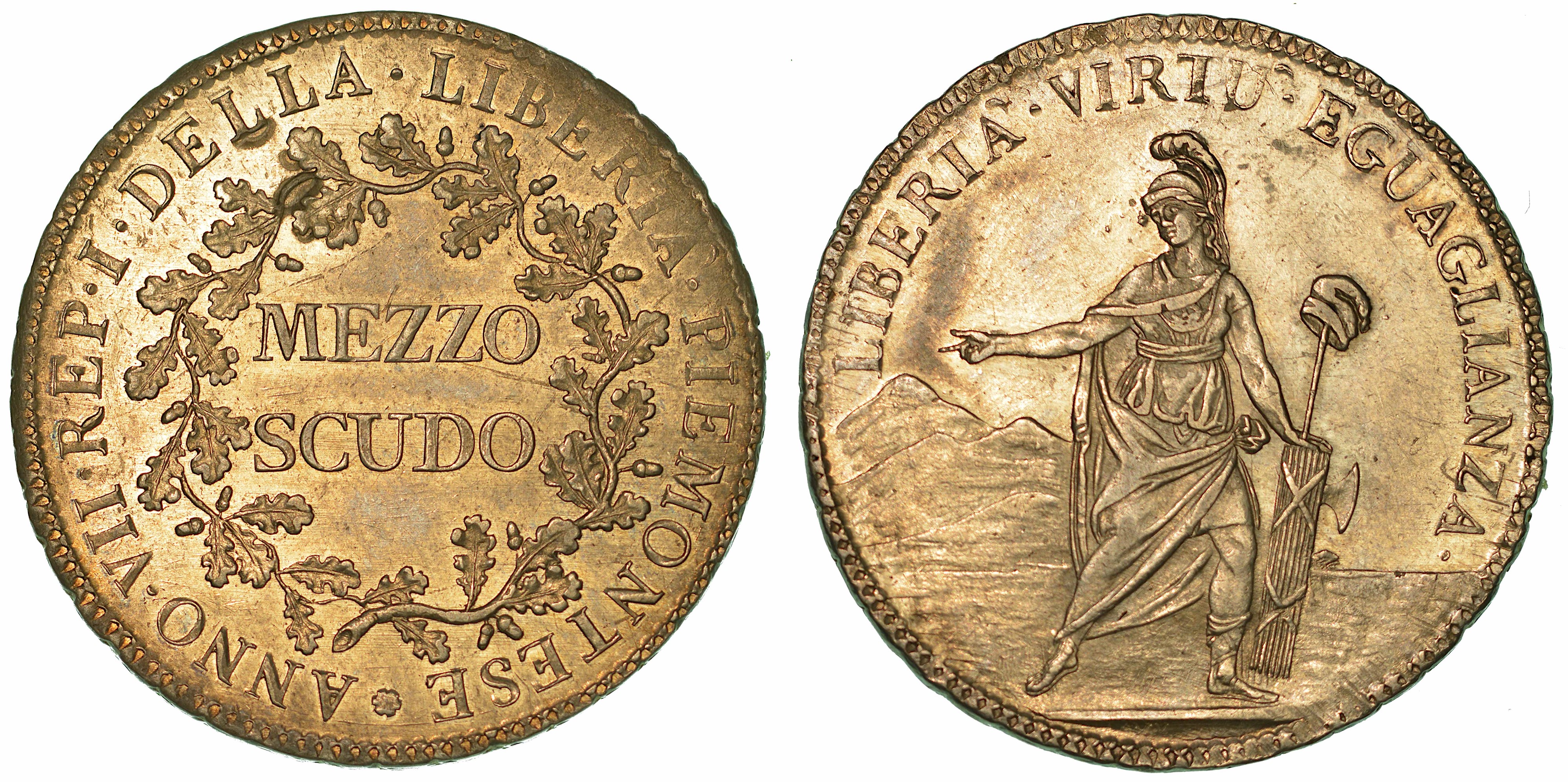 TORINO. REPUBBLICA PIEMONTESE, 1798-1799. Mezzo scudo A. VII.