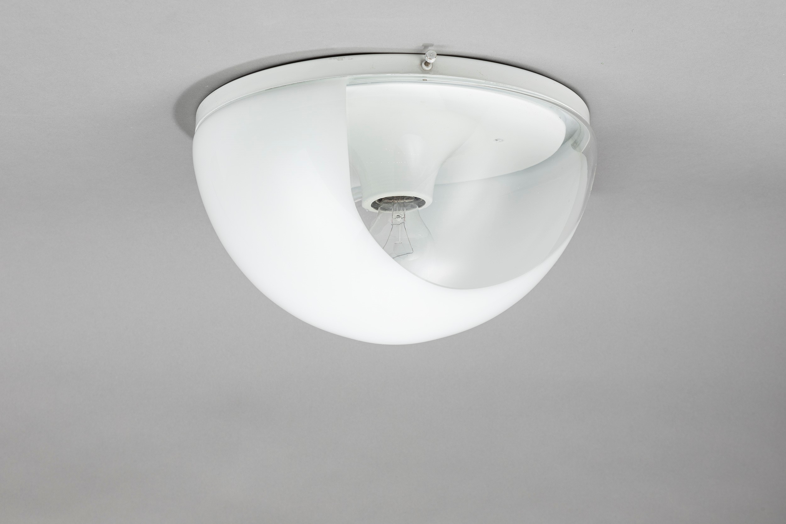 1970 lampada da soffitto o parete con struttura in metallo smaltato e diffusore in vetro soffiato.