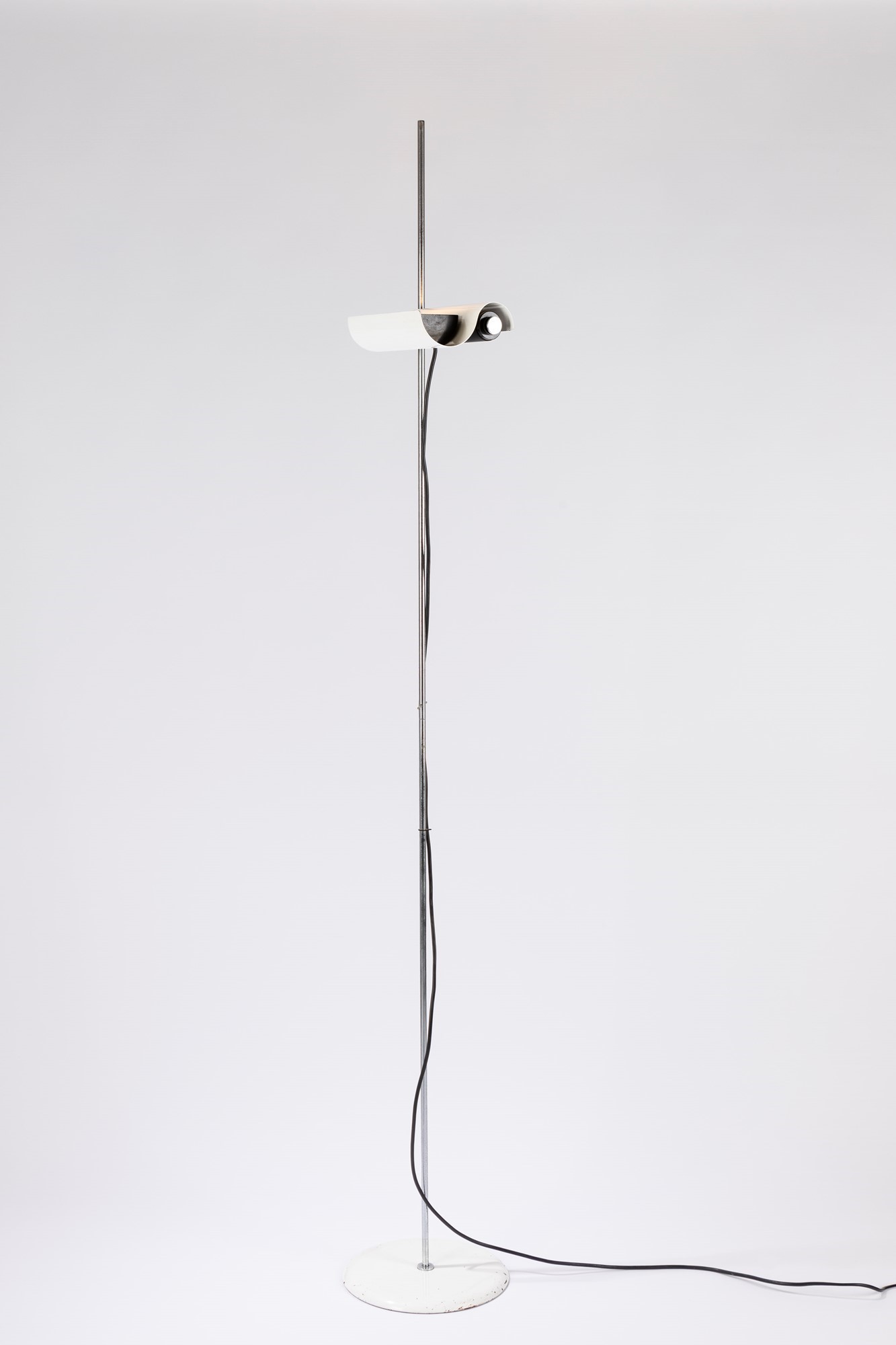 1975 lampada da terra con dimmer, a luce diretta e indiretta, base in acciaio verniciato, stelo cromato, riettore, orientabile e regolabile in altezza, in alluminio verniciato.