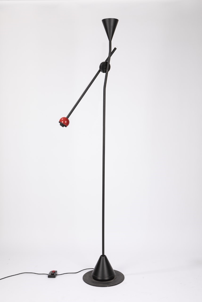 1987 mod. Ettore”, struttura orientabile in metallo verniciato nero e rosso, braccio a due diffusori luminosi.