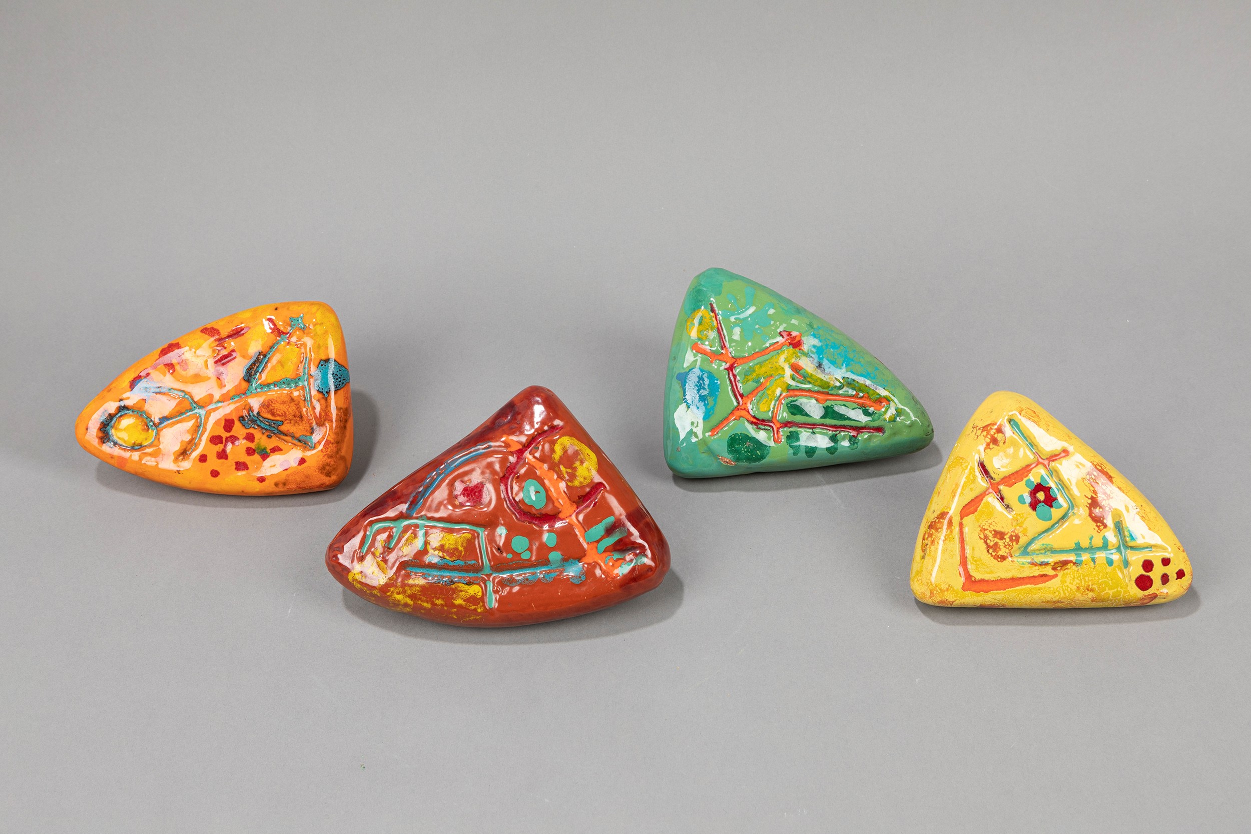 1950 ca. serie di quattro maniglie in ceramica smaltata.