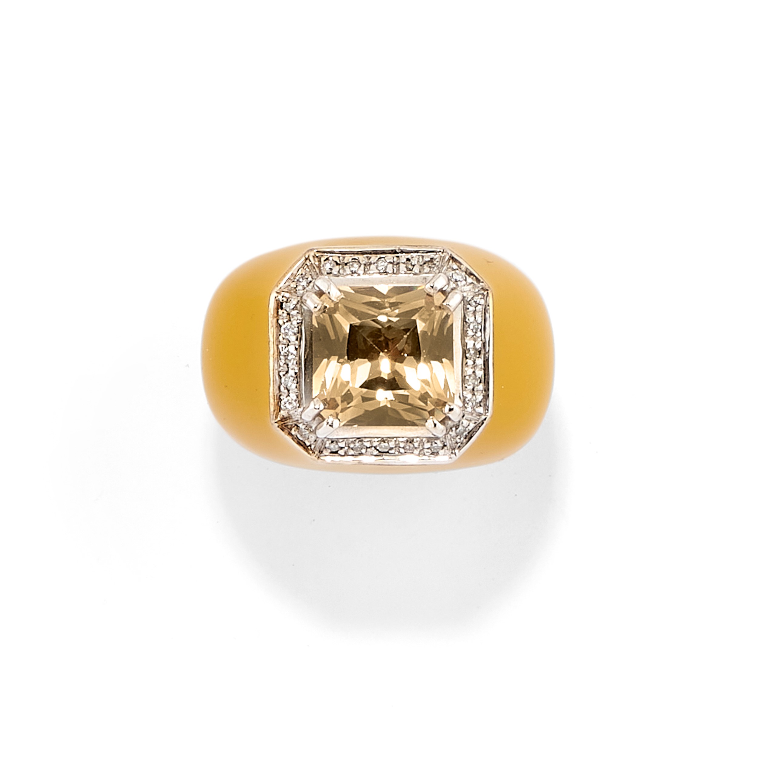 bombato con motivo centrale in quarzo sintetico, diamanti taglio brillante e smalto color senape.