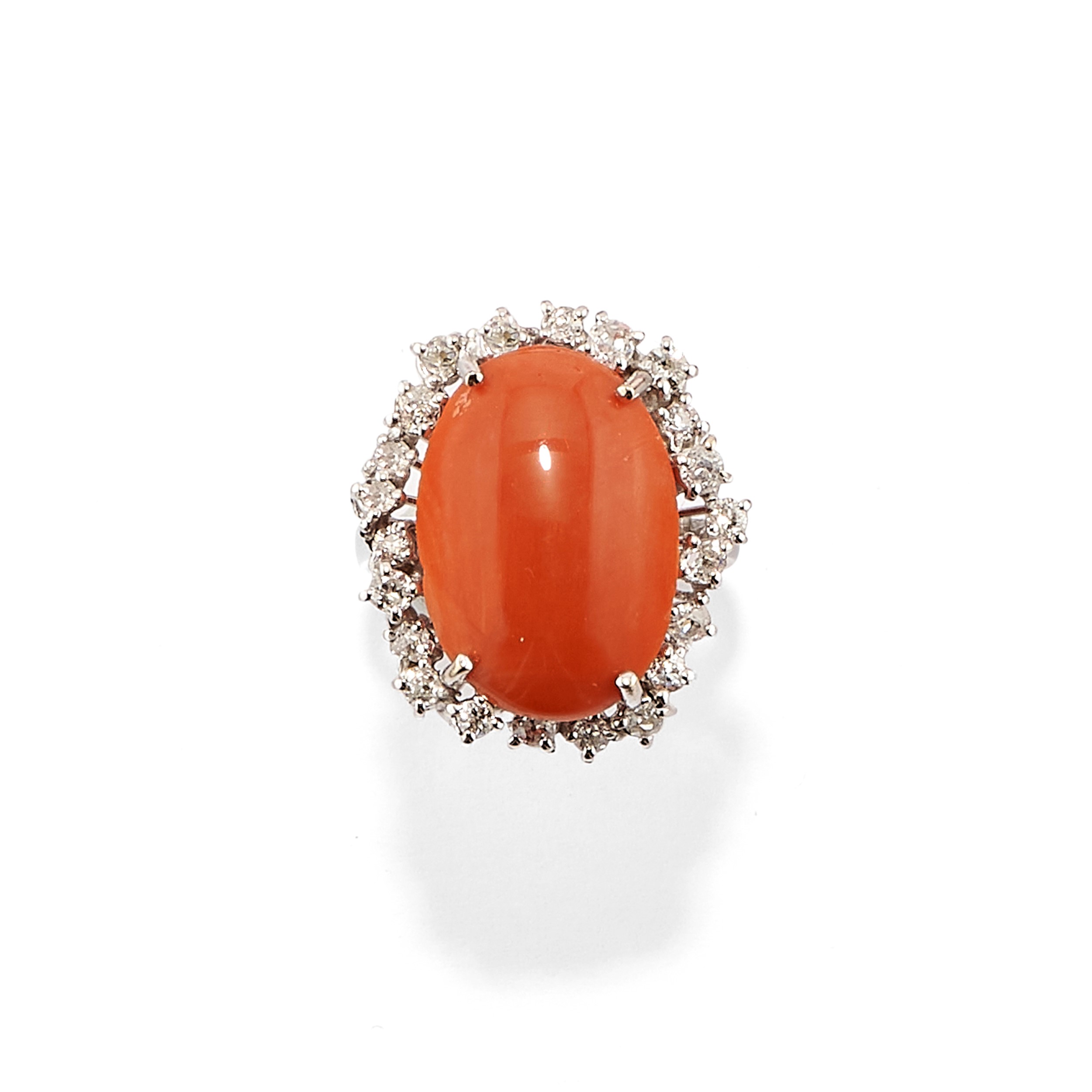 di forma ovale con al centro corallo taglio ovale cabochon contornato da diamanti taglio vecchio.