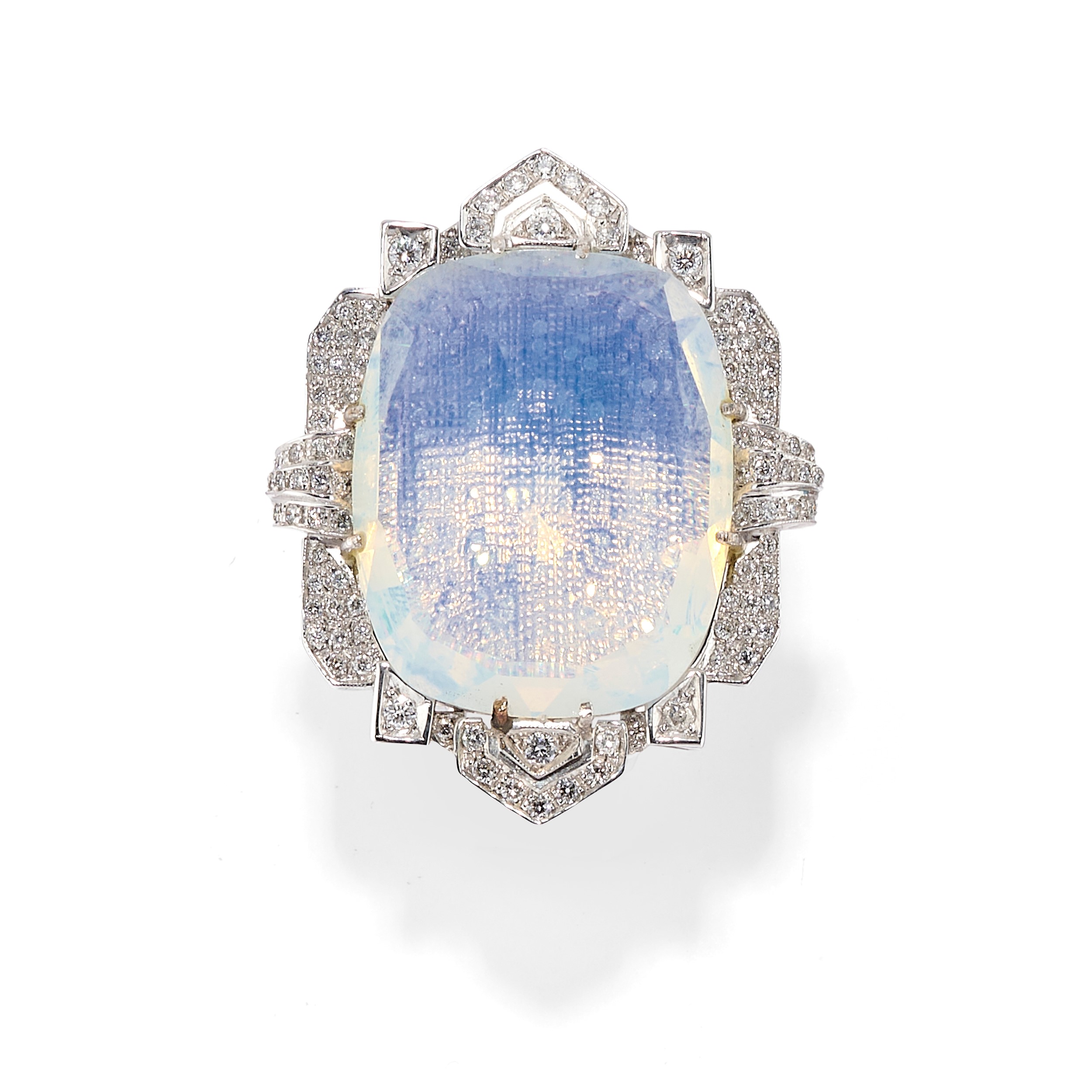con al centro grande opale sintetico taglio ovale sfaccettato decorato da motivi geometrici in diamante taglio brillante, (con molla interna).