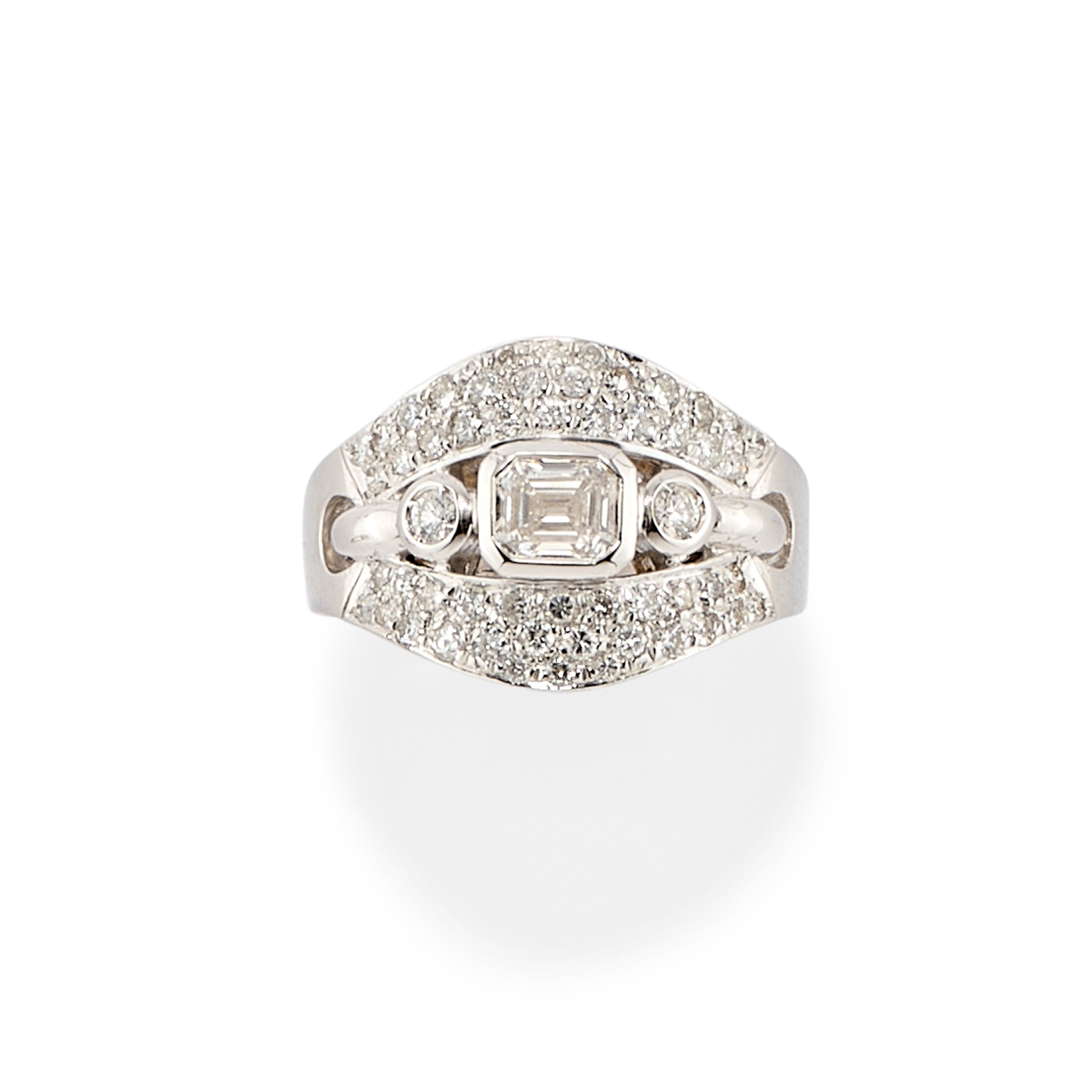 al centro un diamante taglio smeraldo di ct 1,00 circa e contorno in diamanti taglio brillante di ct 1,00 circa.