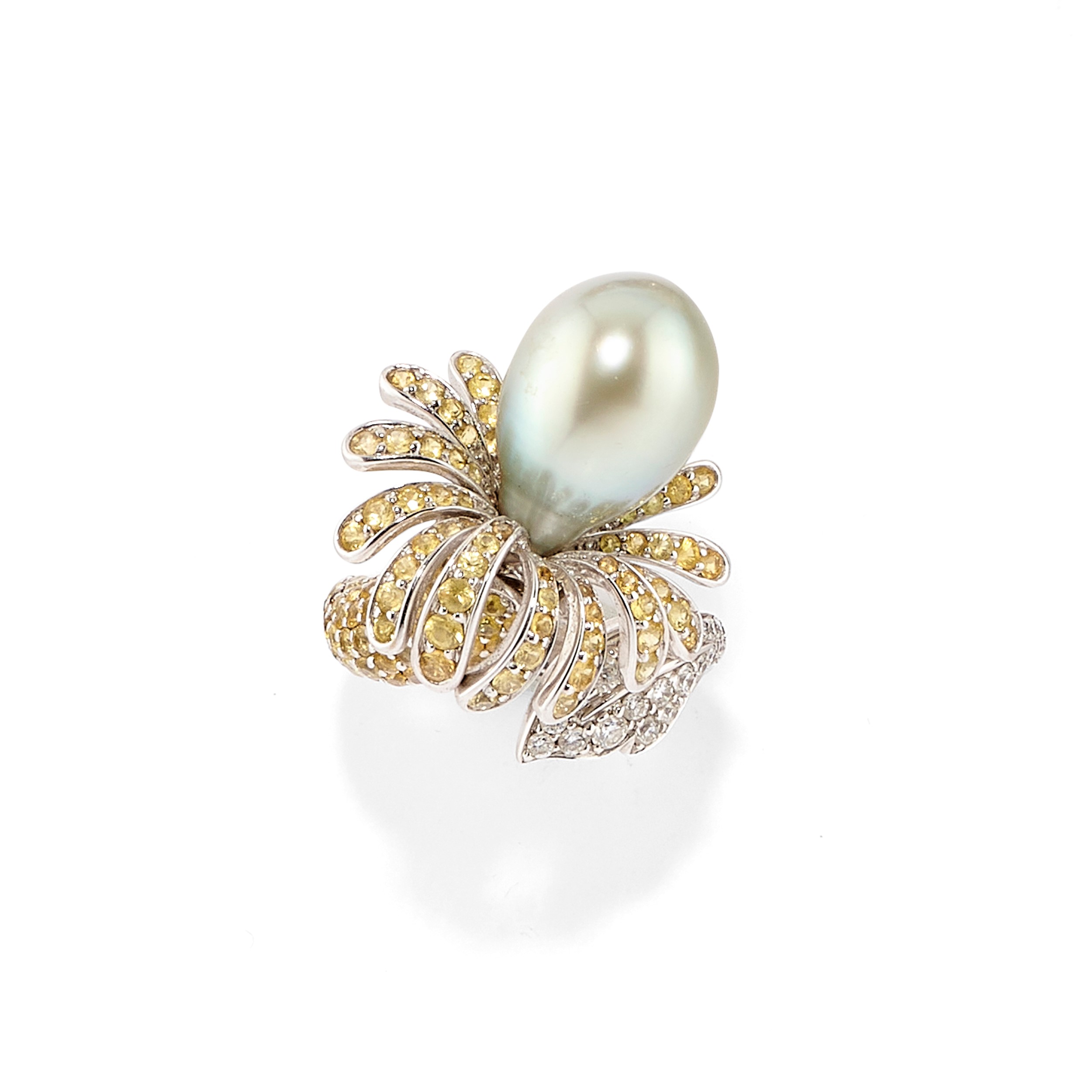 Anello in oro bianco 18k, perla, diamanti e pietre gialle
