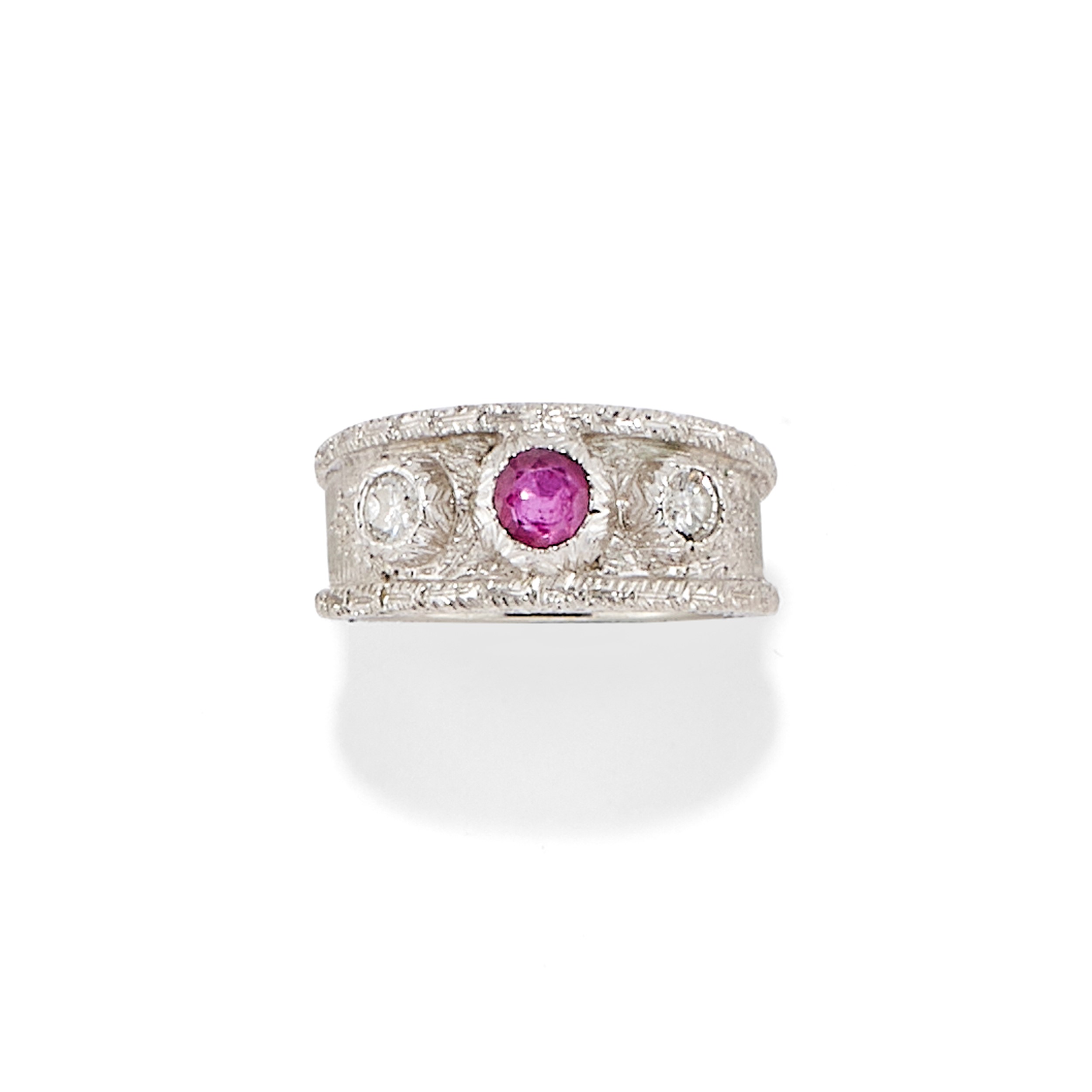 a fascia, con incisioni, rubino taglio rotondo, ai lati diamanti taglio brillante, reca firma M. Buccellati.