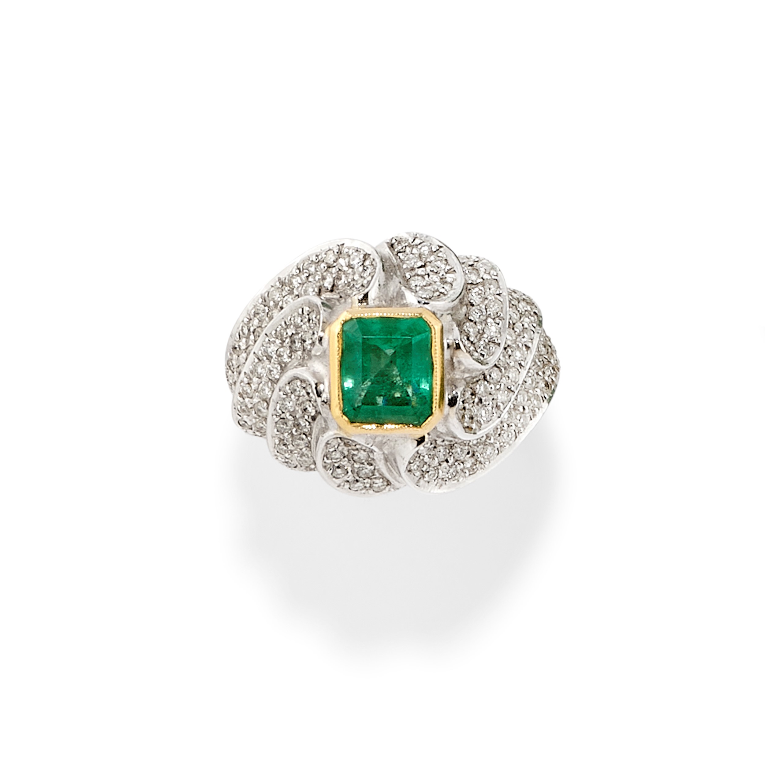 a cupola con smeraldo taglio rettangolare a contorno ottagonale di ct 1,00 circa, contorno in diamanti taglio brillante per totale ct 1,20 circa.
