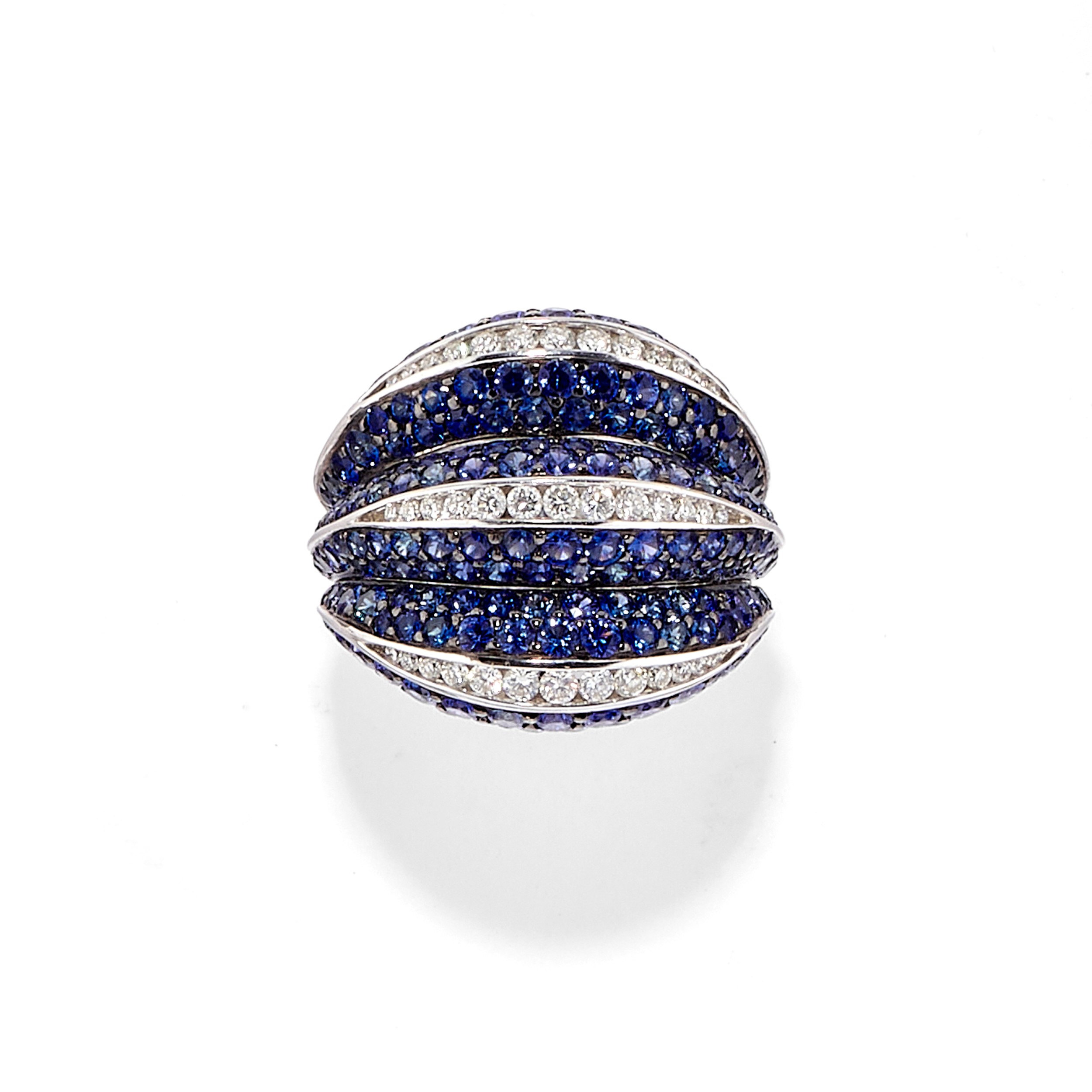 con motivo a tre volute con zaffiri taglio rotondo per totale ct 6,70 e diamanti taglio brillante per totale ct 0,60.