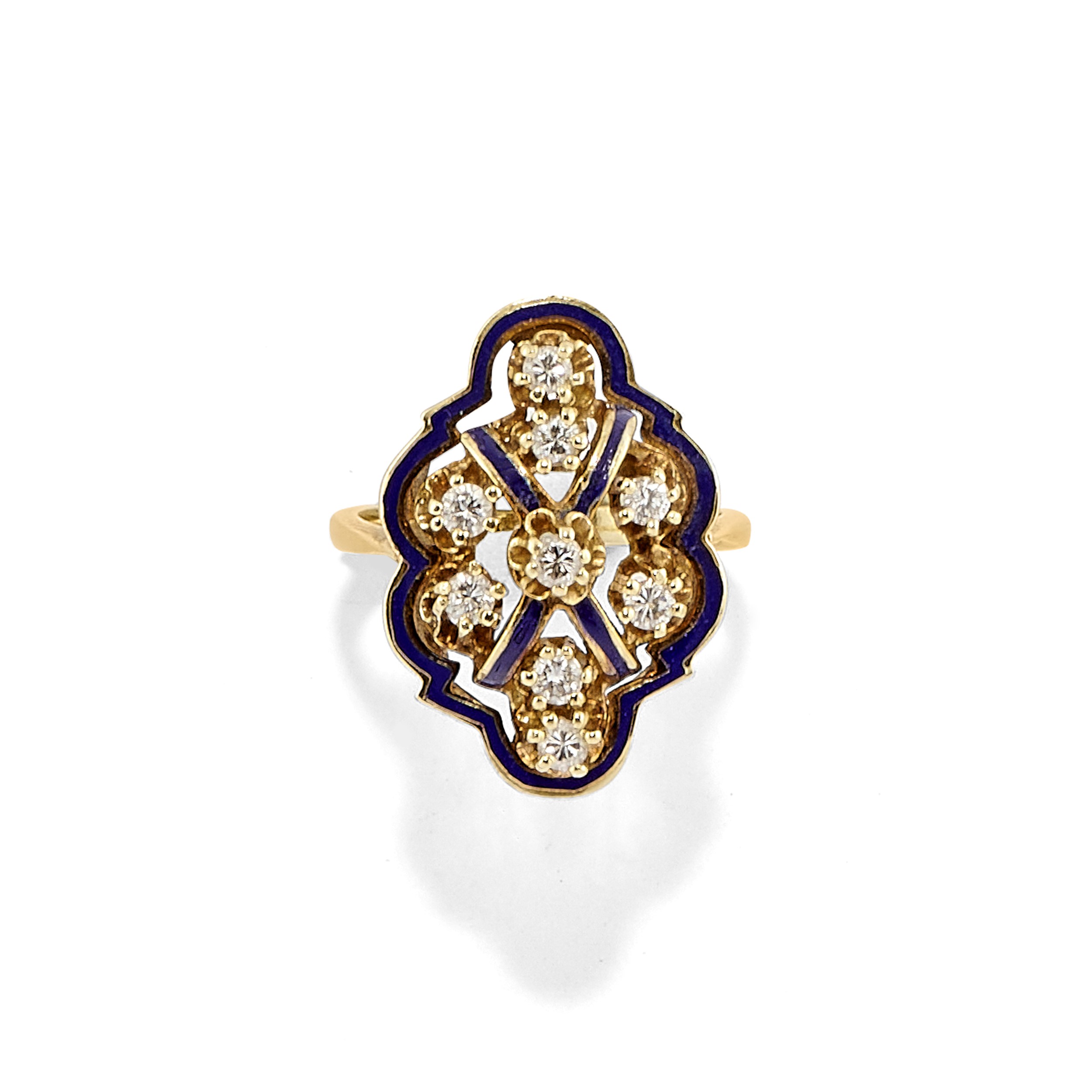 Anello in oro giallo 14k, diamanti e smalto, inizio XX secolo