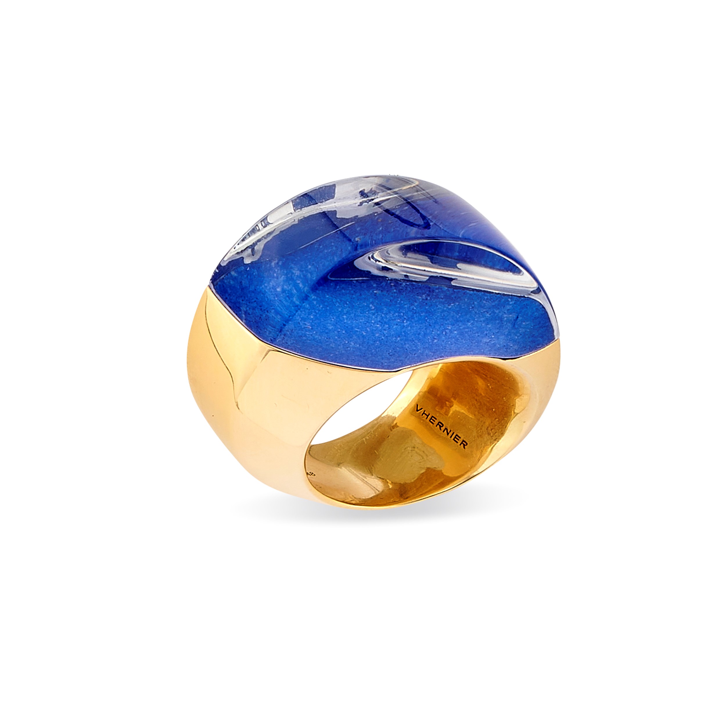 Anello in oro giallo 18k, cristallo di rocca e lapislazzuli