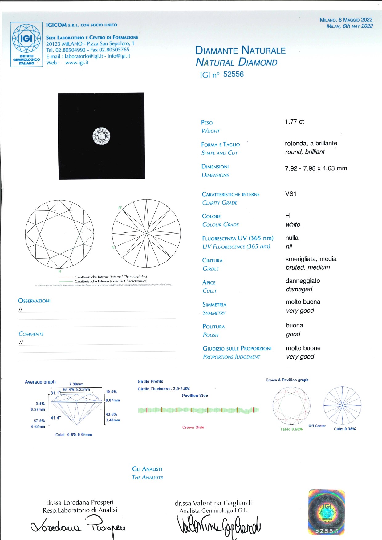 di forma a cuscino con al centro diamante taglio brillante di ct 1,77, colore H, purezza VS1, motivi a raggera in diamanti taglio brillante alternati a tsavoriti taglio costolato.