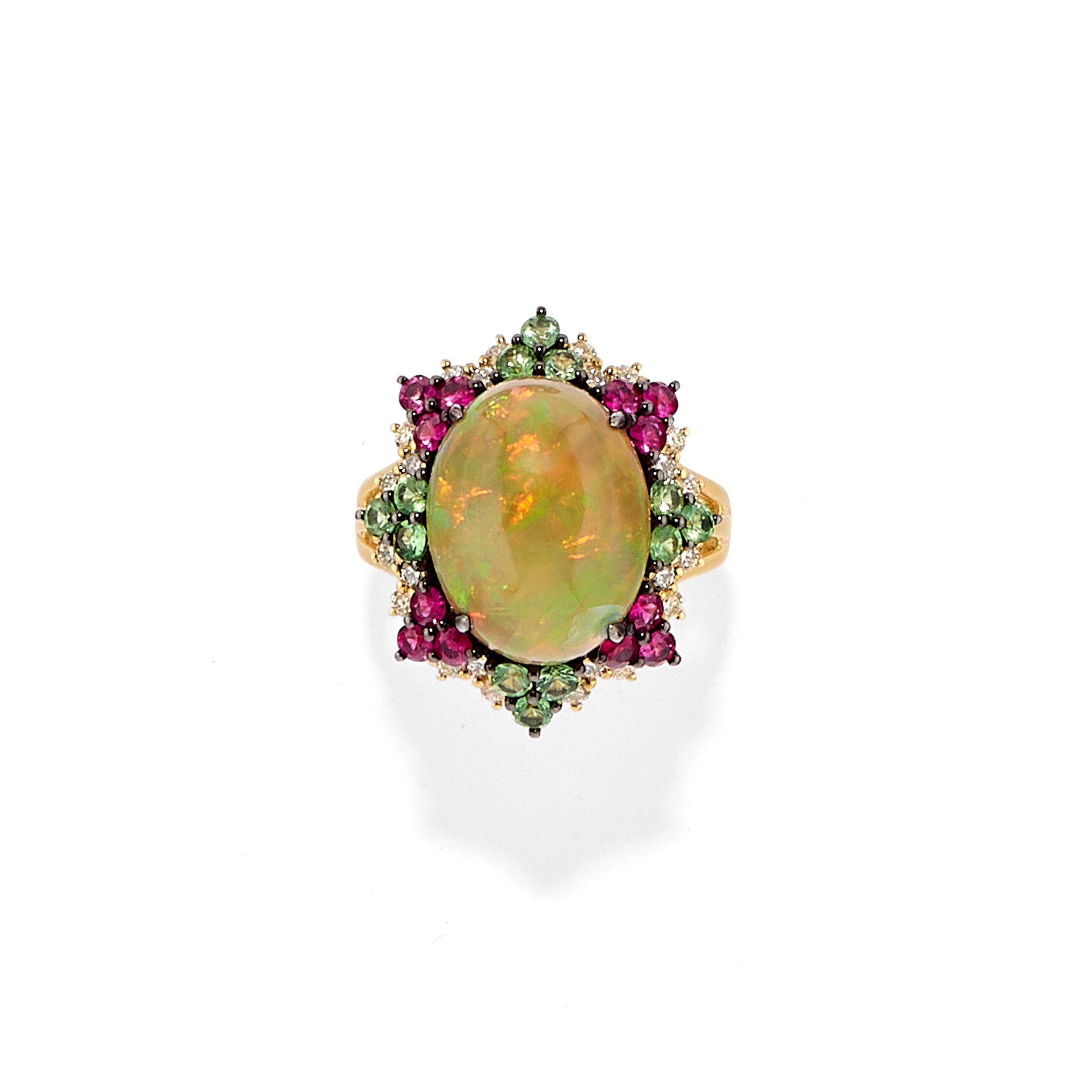 Anello in oro giallo 18k, opale, diamanti, tsavoriti e rubini