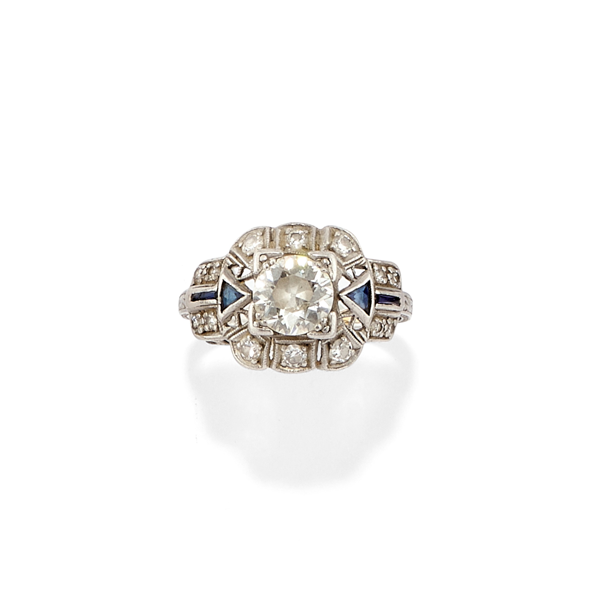 al centro diamante taglio vecchio di ct 1,00 circa, montatura traforata e decorata da diamanti taglio brillante e motivi in lapislazzuli