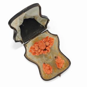 composta da spilla e coppia di orecchini con chiusura a perno avvitabile, realizzati con inserti floreali, con [..]