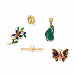 quattro spille con smalti a soggetti diversi e un pendente con malachite. Peso g 22,50