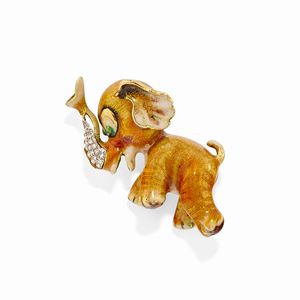 raffigurante due pesciolini e decorata in smalto, piccoli diamanti taglio huit-huit agli occhi. Peso g 13,00 cm [..]