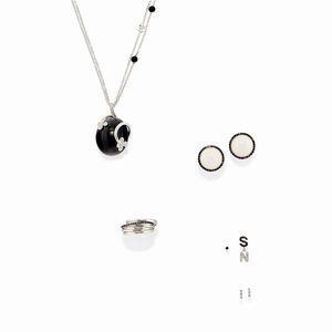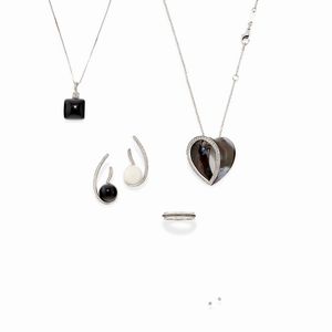 composto da un pendente con catena, tre coppie di orecchini e un anello, decorati da diamanti taglio brillante [..]