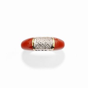 a fascia con motivo centrale in diamanti taglio brillante e corallo. Peso g 7,00 misura 13