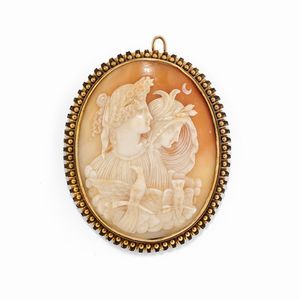 di forma ovale con cammeo scolpito in altorilievo su conchiglia a profili femminili, vetro al retro. Peso g [..]