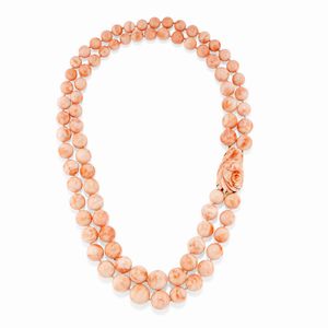 realizzata ad otto fili di corallo di mm 5,00-5,50, chiusura con decoro floreale. Peso g 200,00 cm 64,00