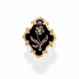 al centro fiore impreziosito da diamanti taglio rosa su fondo in onice nero, elegante cornice a volute, al retro [..]