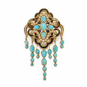 realizzata a volute con motivo frangiato, decorata da turchesi taglio ovale e goccia cabochon, microperle e smalto [..]