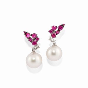 ad un filo di rubini taglio disco disposti a degradè dal centro con chiusura a boule in diamanti taglio brillante [..]