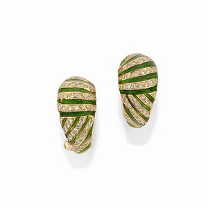 bombati con motivo rigato alternato da diamanti taglio brillante e smalto verde, chiusura a clip. Peso g 12,80