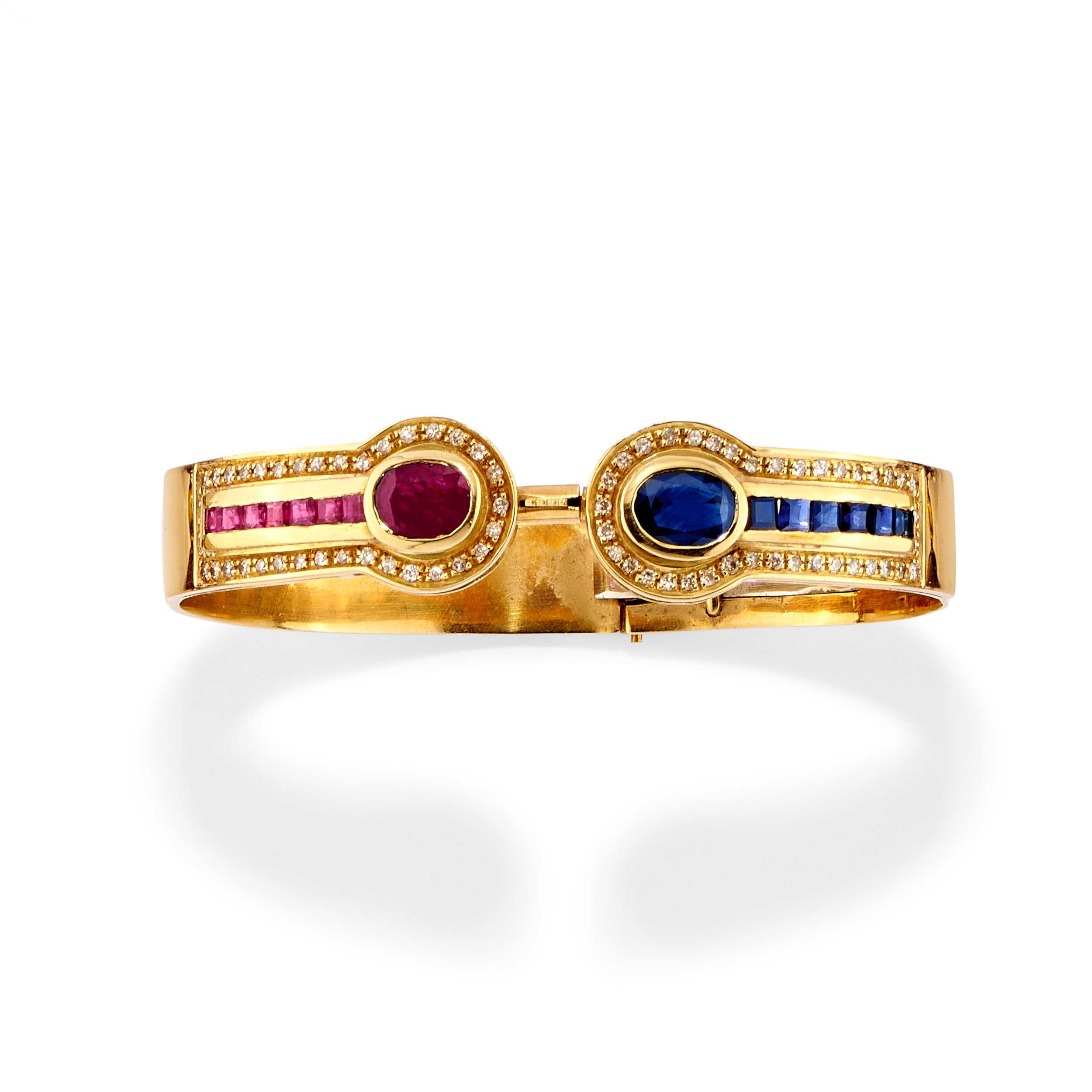 Bracciale rigido in oro giallo 18k, zaffiri, rubini e diamanti