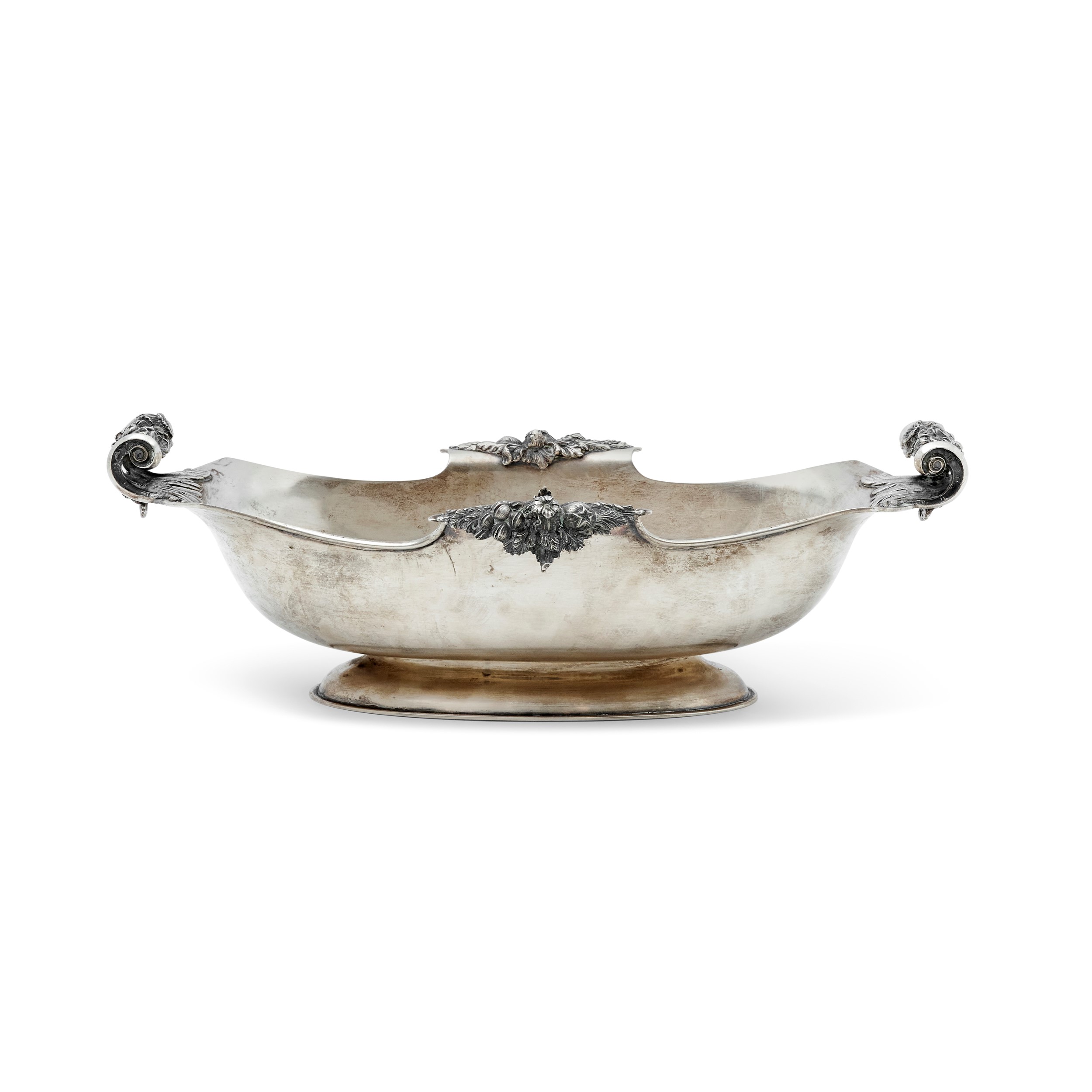 di forma ovale con prese decorate da motivi a fiori e frutti, punzoni del Fascio Littorio.