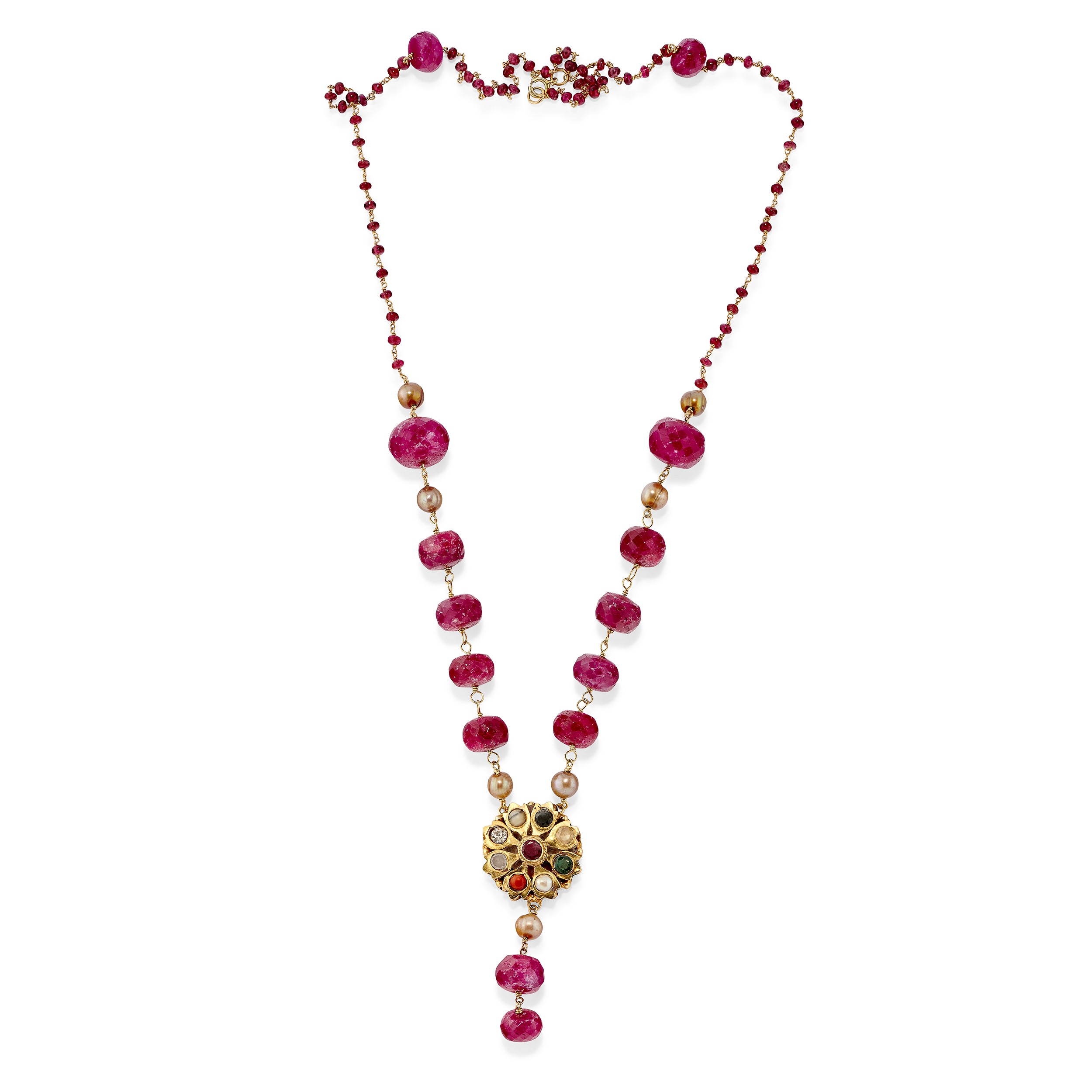 composta da catena con boules sfaccettate in rubini e motivo centrale a rosone con pietre di vari colori.