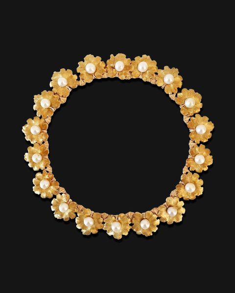 a girocollo con motivi a foglie zigrinate snodate, al centro perle coltivate di mm 8,00-8,50 circa, reca firma M. Buccellati.